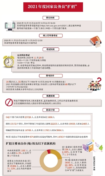 昨日,國家公務(wù)員局發(fā)布公告,今日8時起至10月24日18時,可報名中央機關(guān)及其直屬機構(gòu)2021年度考試。542個部門共計招錄25726人,比去年增加近1600人。明確招錄應(yīng)屆畢業(yè)生14769人,比去年增加3004人。