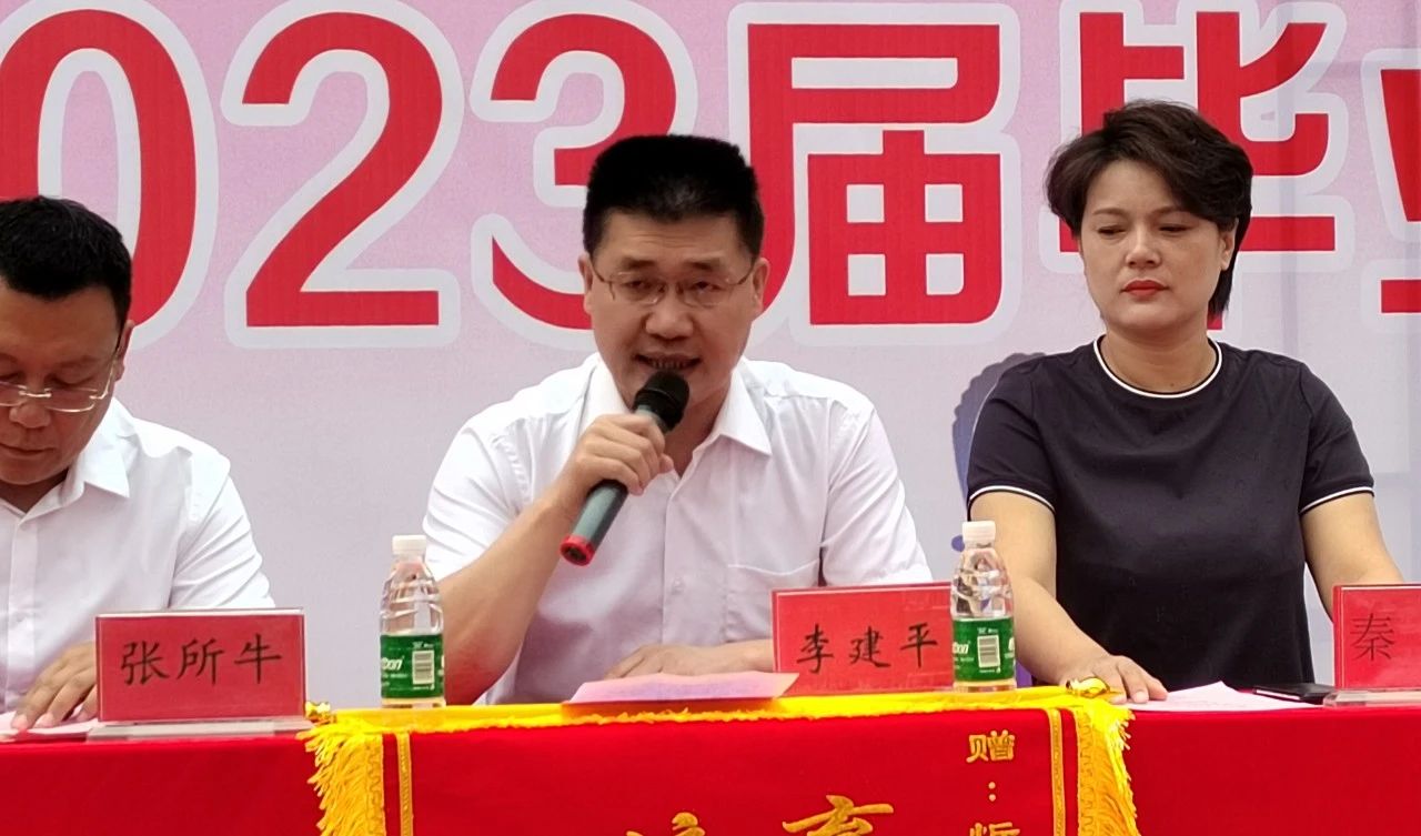 家長代表向?qū)W校贈送錦旗 李建平副校長宣讀《2023屆畢業(yè)決定》,他溫情回顧了初三學(xué)子成長的點滴往事,對同學(xué)們在初中拼搏所取得的優(yōu)異成績表達了祝賀,希望同學(xué)們能深懷一顆感恩之心,奔赴青春的下一個驛站。