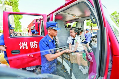 最近,各地學(xué)校陸續(xù)開啟新學(xué)期。圖為8月31日,在四川省眉山市彭山區(qū)學(xué)院路幼兒園,眉山市彭山區(qū)消防救援大隊的消防員為小朋友們介紹消防車上的裝備。新華社記者 王曦攝
