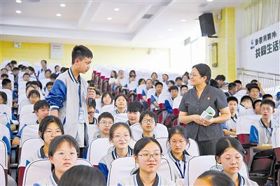 為增強(qiáng)青少年法治觀念,預(yù)防未成年人違法犯罪,構(gòu)建安全和諧的校園環(huán)境,近日,江蘇省鹽城市大豐區(qū)人民法院法官走進(jìn)鹽城市大豐區(qū)城東實(shí)驗(yàn)初級(jí)中學(xué),為該校400多名師生上了秋季開(kāi)學(xué)法治第一課。圖為學(xué)生發(fā)言提問(wèn)法官解答。