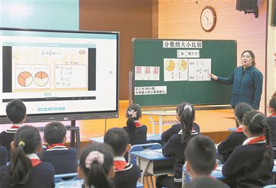在上海市楊浦區(qū)平?jīng)雎返谌W(xué)的“教學(xué)助手”展示課上,老師在黑板上進(jìn)行知識點講解分析,顯示屏上有學(xué)生們的人機(jī)互動結(jié)果和學(xué)習(xí)效果的統(tǒng)計數(shù)據(jù)。 新華社記者 劉穎攝