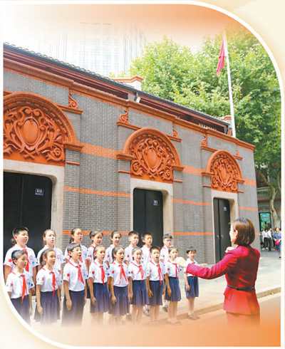 中共一大會(huì)址,上海市的小學(xué)生在老師指揮下齊唱《沒有共產(chǎn)黨就沒有新中國》。陳亞東攝