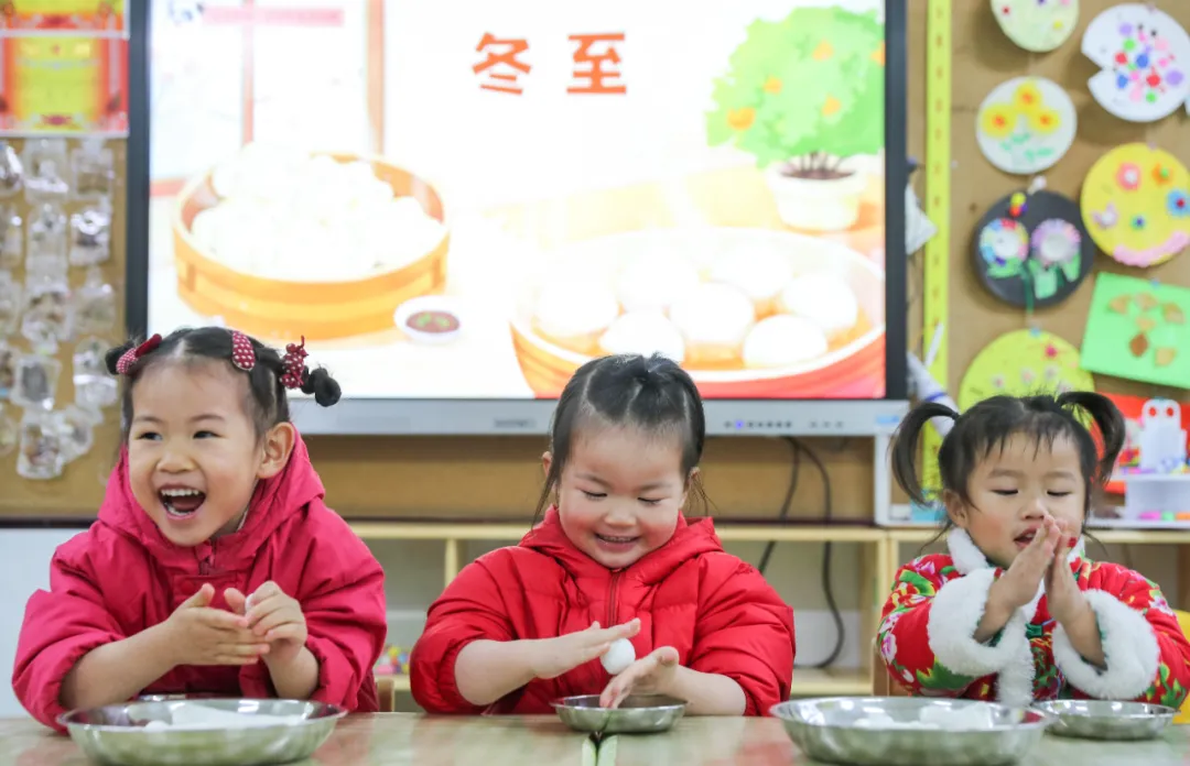 2024年12月20日,貴州省貴陽市開陽縣第二幼兒園的小朋友們?cè)凇爸?xí)俗 迎冬至”活動(dòng)中學(xué)習(xí)搓湯圓。袁福洪 攝