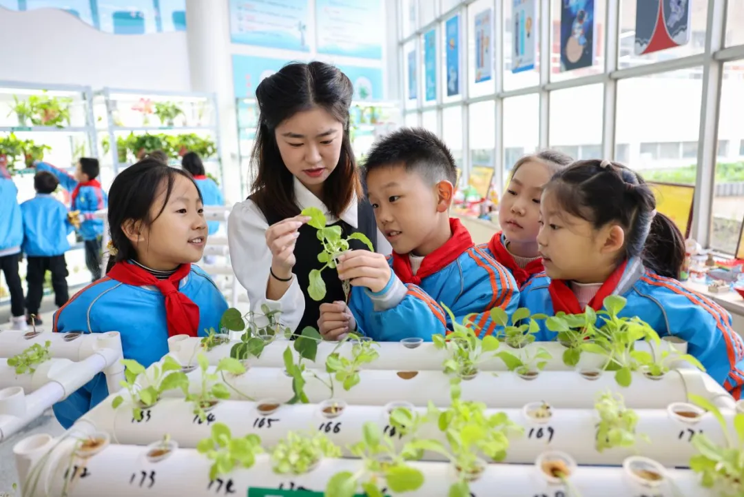 2024年11月21日,在湖北省襄陽市大慶路小學(xué)“校園農(nóng)場”,老師正在講解水培植物的相關(guān)知識(shí)。聶志鵬 付小方 攝