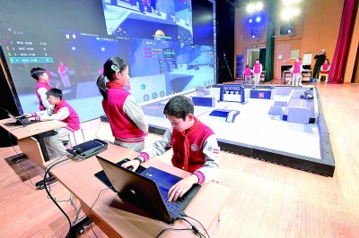 北京市海淀區(qū)實(shí)驗(yàn)小學(xué)的學(xué)生在操控機(jī)甲機(jī)器人進(jìn)行對(duì)抗比賽。新華社發(fā)