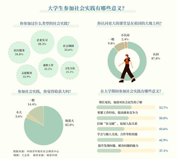 參與實地調(diào)研,開展支教服務(wù),進入企業(yè)實習(xí)……這個夏天,不少大學(xué)生選擇用社會實踐作為暑假的打開方式。日前,中國青年報社社會調(diào)查中心聯(lián)合問卷網(wǎng)(wenjuan.com)發(fā)布的一項有1000名大學(xué)生參與的調(diào)查顯示,82.0%的受訪大學(xué)生認為參加暑期社會實踐收獲大。對于參加社會實踐的意義,53.7%的受訪大學(xué)生認為能增長見識,加深對社會民生的了解,50.0%的受訪大學(xué)生認為能積累工作經(jīng)驗,提高就業(yè)競爭力。87.8%的受訪大學(xué)生認同,更大的課堂是在祖國的大地上。