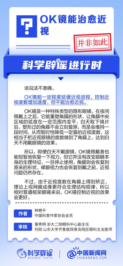 OK鏡能一定程度延緩近視進(jìn)程,控制近視度數(shù)增加速度,但不能治愈近視。OK鏡是一種特殊類(lèi)型的隱形眼鏡,在夜間佩戴上之后,它能重塑角膜的形狀,讓角膜中央?yún)^(qū)域的弧度在一定范圍內(nèi)變平,白天取下鏡片后,塑形過(guò)的角膜不會(huì)立刻復(fù)原,而是會(huì)維持一段時(shí)間,從而暫時(shí)性降低一定量的近視度數(shù)。但它并沒(méi)有改變眼睛本身的生理特征,一旦停止使用,角膜則會(huì)恢復(fù)到原來(lái)的形狀,裸眼視力也會(huì)恢復(fù)到戴之前。(來(lái)源:@科學(xué)辟謠中國(guó)新聞網(wǎng)微博 )
