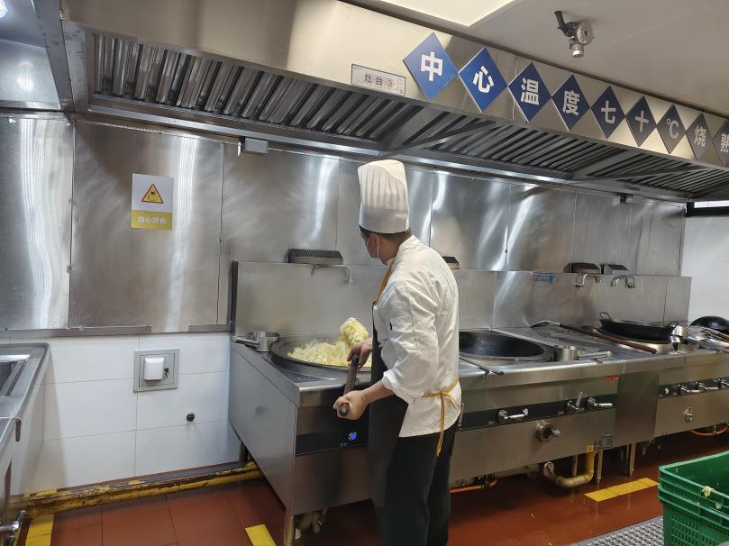 杭州崇文未來學(xué)校食堂后廚一名廚師正在炒菜 打造示范食堂 推動餐食質(zhì)量升級 如何讓孩子們吃得更健康、更開心?蕭山區(qū)江南初級中學(xué)給出了自己的答案。學(xué)校率先推出自助餐模式,實現(xiàn)同樣的餐標(biāo)從套餐到自助餐的轉(zhuǎn)變。這不僅讓孩子們可以根據(jù)自己的口味和食量自主選擇食物,而且菜品豐富多樣,營養(yǎng)搭配均衡。為確保菜品營養(yǎng)搭配科學(xué),學(xué)校邀請持有營養(yǎng)師證的老師、家長共同參與制定菜單、體驗餐品。通過引進自動炒菜機,讓菜品配比更科學(xué),油鹽更精準(zhǔn),品控更保證,人工成本更節(jié)省。