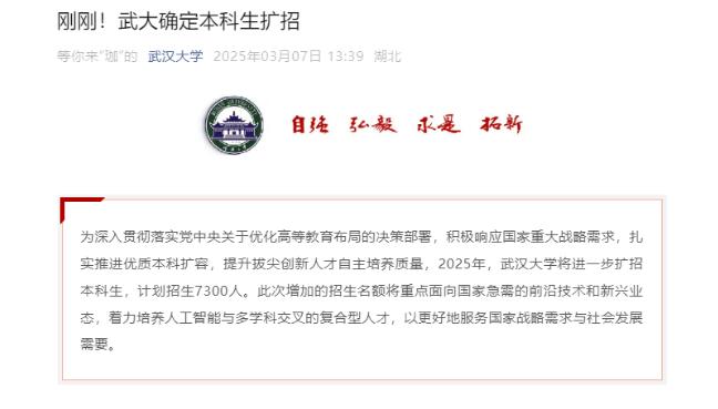 3月7日,據(jù)武漢大學(xué)微信公眾號消息,為深入貫徹落實黨中央關(guān)于優(yōu)化高等教育布局的決策部署,積極響應(yīng)國家重大戰(zhàn)略需求,扎實推進(jìn)優(yōu)質(zhì)本科擴(kuò)容,提升拔尖創(chuàng)新人才自主培養(yǎng)質(zhì)量,2025年,武漢大學(xué)將進(jìn)一步擴(kuò)招本科生,計劃招生7300人。此次增加的招生名額將重點面向國家急需的前沿技術(shù)和新興業(yè)態(tài),著力培養(yǎng)人工智能與多學(xué)科交叉的復(fù)合型人才,以更好地服務(wù)國家戰(zhàn)略需求與社會發(fā)展需要。