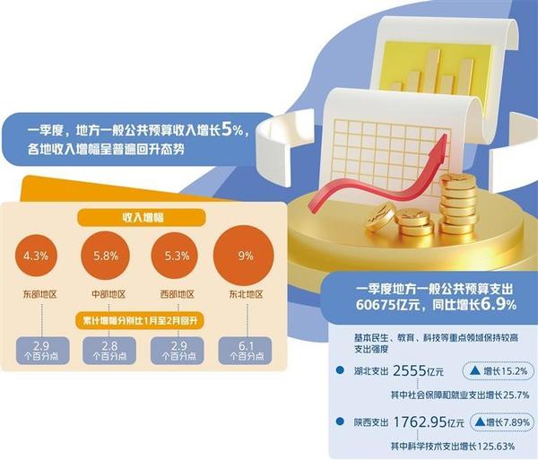 一季度,地方一般公共預(yù)算支出60675億元,同比增長(zhǎng)6.9%。各地普遍在基本民生、教育、科技等重點(diǎn)領(lǐng)域保持較高支出強(qiáng)度。比如,湖北一季度地方一般公共預(yù)算支出2555億元,增長(zhǎng)15.2%,其中社會(huì)保障和就業(yè)支出增長(zhǎng)25.7%。陜西一季度一般公共預(yù)算支出1762.95億元,增長(zhǎng)7.89%,其中科學(xué)技術(shù)支出增長(zhǎng)125.63%。“各地財(cái)政支出繼續(xù)保持較快增長(zhǎng),衛(wèi)生、社保、科技和農(nóng)林水支出增速加快,財(cái)政公共服務(wù)和保障能力不斷增強(qiáng)?!奔质∝?cái)政科學(xué)研究所所長(zhǎng)張依群表示。