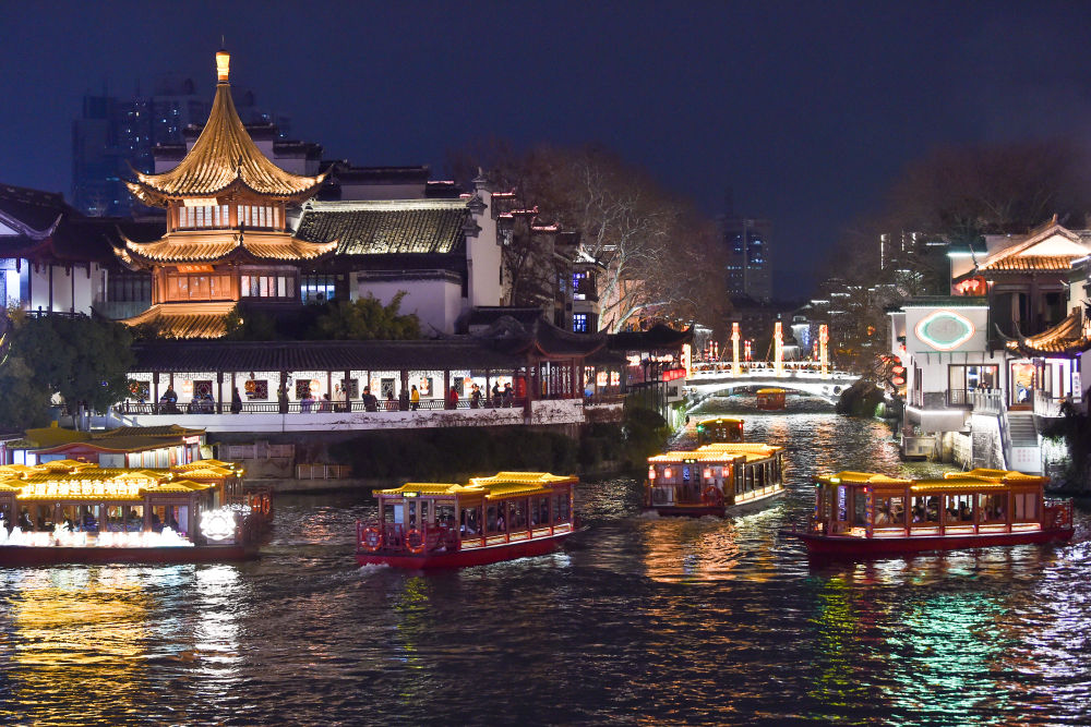 游客在江蘇省南京市夫子廟景區(qū)乘船夜游秦淮河(2023年2月2日攝)。新華社發(fā)(方東旭 攝)