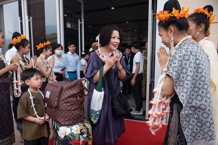 在中老鐵路老撾磨丁站,工作人員歡迎乘坐D887次國際旅客列車的旅客抵達(dá)磨?。?023年4月13日攝)。新華社發(fā)(凱喬 攝)