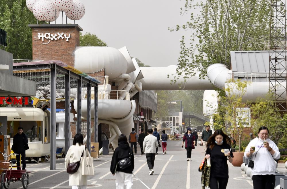 游人在老舊廠區(qū)改造的北京朗園文創(chuàng)園區(qū)參觀(2023年4月12日攝)。新華社記者 李欣 攝