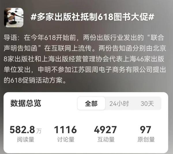 日前,兩份來自出版行業(yè)的“聯(lián)合聲明告知函”在網(wǎng)上流傳,引發(fā)大范圍討論,并最終成為一個焦點(diǎn)話題,“多家出版社抵制618圖書大促”。
