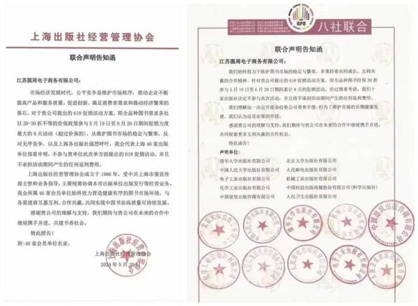 網(wǎng)上流傳的兩份“聯(lián)合聲明告知函”顯示,北京的一些出版社,以及上海出版社經(jīng)營管理協(xié)會代表上海46家出版單位,均聲明不參與江蘇圓周電子商務(wù)有限公司此次提出的618促銷活動方案,也不承擔(dān)活動期間產(chǎn)生的任何返利費(fèi)用。