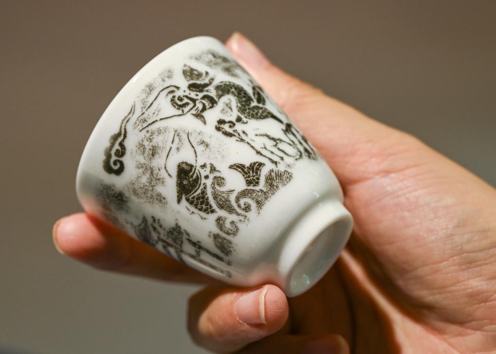在浙江臺(tái)州仙居縣白塔鎮(zhèn)上葉村仙居巖畫藝術(shù)中心內(nèi),工作人員展示根據(jù)當(dāng)?shù)貛r畫開(kāi)發(fā)的文創(chuàng)禮品(7月28日攝)。新華社記者 李賀 攝