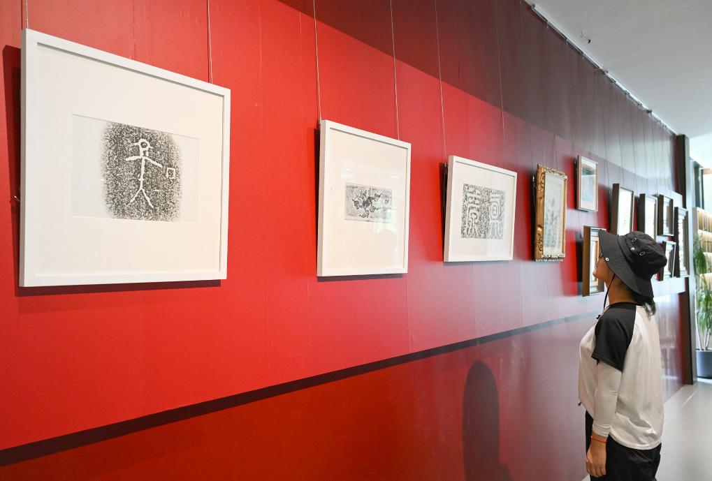 這是在浙江臺(tái)州仙居縣白塔鎮(zhèn)上葉村仙居巖畫藝術(shù)中心內(nèi)展出當(dāng)?shù)貛r畫拓片(7月28日攝)。新華社記者 李賀 攝