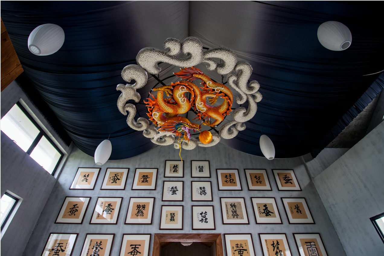 走入云龍村的云龍記憶館,縱使見(jiàn)多識(shí)廣,全國(guó)主流媒體記者們也依然被盤(pán)旋于頂?shù)拇T大金龍震撼到了,紛紛掏出手機(jī)拍個(gè)不停:這條金龍是用15000多個(gè)蠶繭制作而成,外圍是蠶繭組成的祥云,包裹著里面的金龍,這是云龍村的象征。