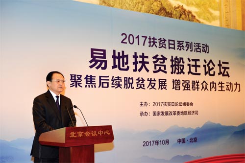 本次論壇以“聚焦后續(xù)脫貧發(fā)展,增強(qiáng)群眾內(nèi)生動(dòng)力”為主題,是2017 年扶貧日系列活動(dòng)之一。來(lái)自國(guó)家發(fā)改委、人力資源社會(huì)保障部、國(guó)土資源部、交通運(yùn)輸部、水利部、農(nóng)業(yè)部、商務(wù)部、中國(guó)人民銀行、國(guó)家林業(yè)局、國(guó)家旅游局、銀監(jiān)會(huì)、國(guó)務(wù)院扶貧辦、全國(guó)工商聯(lián)、國(guó)家開(kāi)發(fā)銀行、中國(guó)農(nóng)業(yè)發(fā)展銀行等部門(mén)和單位有關(guān)司局負(fù)責(zé)同志,全國(guó)22 個(gè)有易地扶貧搬遷任務(wù)的省份發(fā)展改革委負(fù)責(zé)同志以及部分省、市、縣從事易地扶貧搬遷工作的干部群眾,帶動(dòng)搬遷群眾脫貧致富的部分龍頭企業(yè)代表,共約100 人參加了論壇。