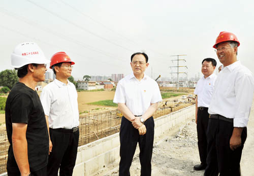 在忻州西站以北的大西客專與忻五公路交叉地段,京太鐵路(雄忻段)引入大西客專施工現場,李俊明詳細了解大西客專既有線路、雄忻高鐵接軌的近期工程和預留遠期規(guī)劃,實地察看左右進出線的路基打樁、擋墻施工、路基幫寬等正在進行的工程,聽取各主要節(jié)點工期計劃安排,詢問工程實施中的困難問題。