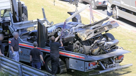 科尼塞克早上發(fā)布消息稱(chēng)One:1打算在紐北刷新最快圈速紀(jì)錄。知情人表示,刷圈過(guò)程中,車(chē)輛在高速駛?cè)階denauer Forst彎時(shí)發(fā)生失控,車(chē)身撞跨賽道左側(cè)的護(hù)欄,進(jìn)而飛入草地,事故令One:1車(chē)身?yè)p毀嚴(yán)重,前保險(xiǎn)杠折斷、擋風(fēng)玻璃破碎,尾部受損。