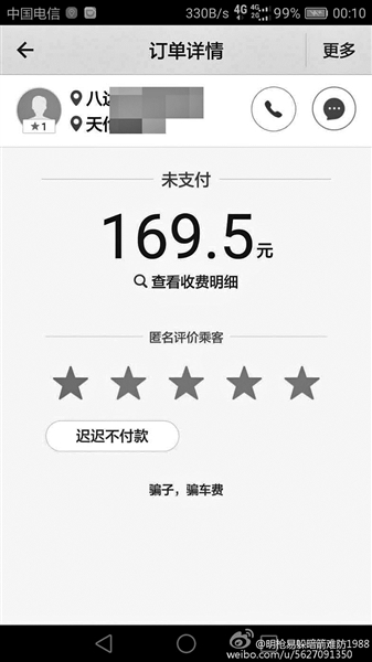 陳女士的父親最近也有相似經(jīng)歷。大約一個月前,陳女士的父親通過滴滴接到了一個預約用車單,次日一大早如約接送了該名客人,之后卻遲遲收不到付款。陳女士說:“早上5點多一起床就去接他了,那么冷的天,結果白跑了?!标惻扛嬖V北京青年報記者,被拖欠的車費金額僅有48.7元,也不算太高,但出事后多次投訴始終沒能解決,快50歲的父親覺得很憋屈。