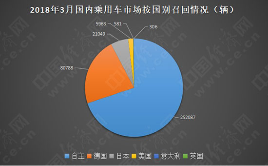 分國別來看,3月發(fā)布召回公告的13個(gè)品牌中:自主共1個(gè)品牌召回汽車252087輛,占總召回量69.87%,召回?cái)?shù)量最大;其次,德系3個(gè)品牌累計(jì)召回汽車80788輛,占比22.39%;接下來,日系共4個(gè)品牌累計(jì)召回汽車21049輛,占比5.83%;之后,美系2品牌召回汽車5963輛,占比1.65%;意大利和英系各自召回汽車581輛和306輛,分別占比0.16%和0.08%。