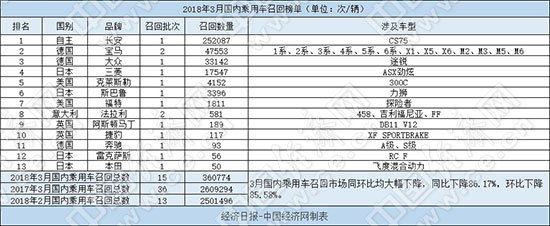 根據(jù)國家質(zhì)檢總局缺陷產(chǎn)品管理中心3月份發(fā)布的召回公告,經(jīng)濟(jì)日報(bào)-中國經(jīng)濟(jì)網(wǎng)汽車頻道經(jīng)過匯總、統(tǒng)計(jì),整理出“2018年3月國內(nèi)乘用車召回榜單”。3月,國內(nèi)乘用車市場共有13個(gè)品牌發(fā)布15次召回公告,累計(jì)召回汽車360774輛,召回?cái)?shù)量同環(huán)比均出現(xiàn)大幅下降,其中同比下降86.17%,環(huán)比下降85.58%。