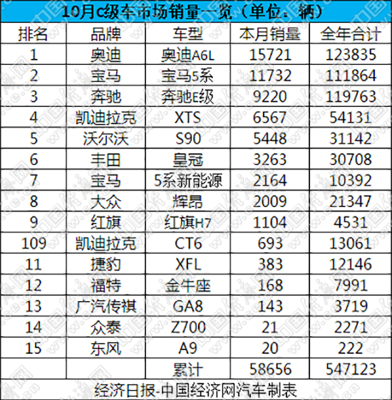 統(tǒng)治C級車市場近30年的奧迪A6L,即便處在產(chǎn)品生命期末端,依舊不減“老大”的霸氣。數(shù)據(jù)顯示,A6L在10月份的銷量達(dá)15721輛,勇奪單月銷量冠軍;前10個月的累計銷量為123835輛,趕超奔馳E級,重新收獲C級車市場的銷量冠軍。