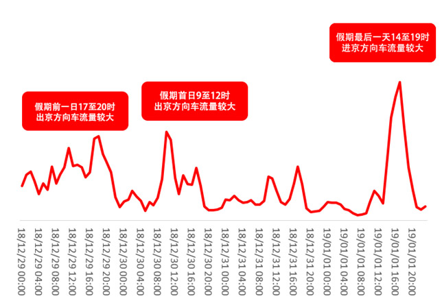 12月29日、30日出京高峰期間,京藏高速、京承高速、京新高速、京港澳高速等部分路段車流集中,特別是京藏高速、京新高速交通壓力將較往年有所增加。