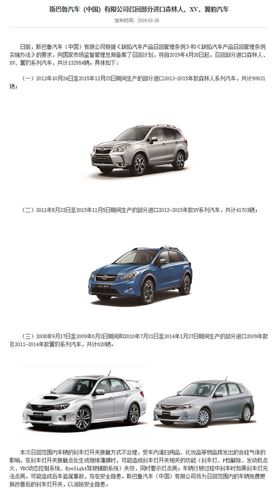 從召回原因來看,本月斯巴魯涉及132954輛汽車的召回不僅數(shù)量最大,召回原因也頗具“創(chuàng)意”。該批車輛因剎車燈開關(guān)接觸方式不合理,受車內(nèi)清掃用品、化妝品等物品揮發(fā)出的含硅氣體的影響,在剎車燈開關(guān)接觸點處生成絕緣薄膜時,可能造成剎車燈開關(guān)相關(guān)的功能(剎車燈、P檔解除、發(fā)動機(jī)點火、VDC動態(tài)控制系統(tǒng)、EyeSight駕駛輔助系統(tǒng))失效,同時警示燈點亮;車輛行駛過程中剎車時如果剎車燈無法點亮,可能造成后車追尾事故,存在安全隱患。