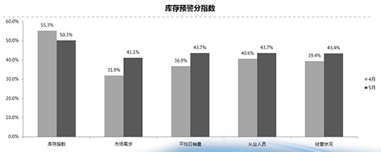 從庫存預(yù)警分指數(shù)來看,市場(chǎng)需求指數(shù)、平均日銷量指數(shù)、從業(yè)人員指數(shù)、經(jīng)營(yíng)狀況指數(shù)環(huán)比上升,庫存指數(shù)環(huán)比下降。