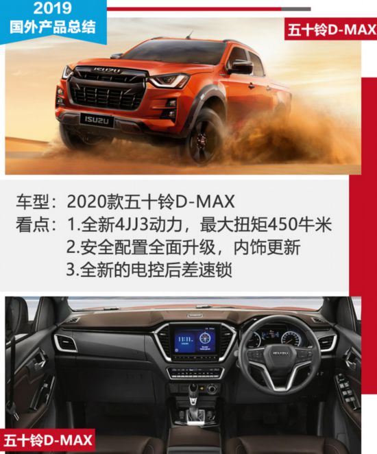 另外一款在國際市場掀起波瀾的新車就要屬2020款五十鈴D-MAX了,作為國際皮卡市場兼具生活方式和工具用的多功能皮卡產(chǎn)品,2020款五十鈴D-MAX的推出指明了未來國際中型尺寸皮卡到底該有什么樣素質。 2020款五十鈴D-MAX一改之前的造型設計,以全新的面孔示人,全新的外觀設計更加激進野蠻,車身線條棱角如剃刀般鋒利!如果要我給它命名我一定會叫它“剃刀Razor”足見其外觀的侵略性。動力上,是不少車迷感到欣慰的一點,有1.9T和3.0T兩款柴油發(fā)動機可選,而此次出現(xiàn)的3.0T柴油機并不是之前的4JJ1,而是全新的Bluepower動力,被稱為4JJ3。全新的3.0T柴油機進一步壓榨動力,最大馬力達190匹,最大扭矩高達450牛米。而1.9T的最大馬力為150匹,最大扭矩350牛米。 懸掛方面,前為全新設計的雙叉臂,后為更耐用更結實的鋼板彈簧。另外,這一代車型一改之前的自鎖式伊頓差速鎖,改為主動控制的電控差速鎖,更容易脫困,越野能力更強。而且涉水深度達800mm。這一次的五十鈴D-MAX帶來了更多的主動安全系統(tǒng),包括盲區(qū)監(jiān)測,緊急制動信號燈,以及LED大燈、6安全氣囊、320mm碟剎等。內飾也一次翻天覆地的改變,更加動感,一改之前老氣的設計,座椅包裹性也更強,并配備了鍍鉻裝飾的擋把和空調控制區(qū)按鈕,坐進車內并不會感覺這是一輛皮卡,而更像一輛運動轎車。另外,新車還有一些新功能,包括遠程啟動、8雷達、停車盲區(qū)預警、感應雨刷,自動感應迎賓燈、伴我回家燈等。 電動福特F-150