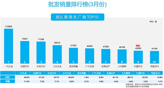 分不同級別市場來看,受換購市場興旺推動,高檔品牌表現(xiàn)依舊突出,3月,高檔品牌銷量同比“僅”下滑20%;尤其以批發(fā)量來看,北京奔馳高居廠商批發(fā)量第5名,華晨寶馬同樣擠進前十,體現(xiàn)出了廠家、經銷商對后市的絕對信心。主流合資品牌中,德系品牌份額擴大4.4%,而日系品牌則下滑1.9%。