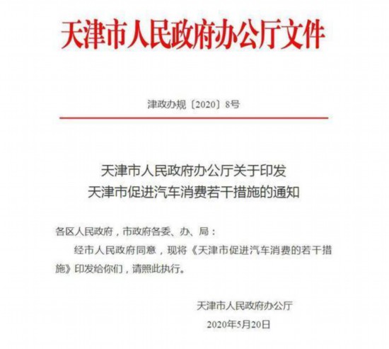 5月20日,天津市人民政府辦公廳印發(fā)《天津市促進汽車消費的若干措施》(以下簡稱《措施》),2020年內新增小客車個人增量指標配置額度35000個。