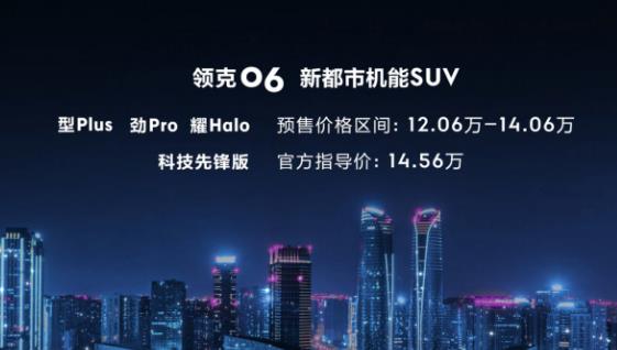 2020年7月24日,領(lǐng)克06于成都車展公布了型Plus、勁Pro、耀Halo三款車型的預(yù)售價(jià)格,區(qū)間為12.06-14.06萬(wàn),并于7月24日下午16:06于領(lǐng)克商城開啟線上預(yù)訂。同時(shí),首發(fā)600臺(tái)科技先鋒版,價(jià)格為14.56萬(wàn),將于8月6日16:06在領(lǐng)克商城開啟搶訂。