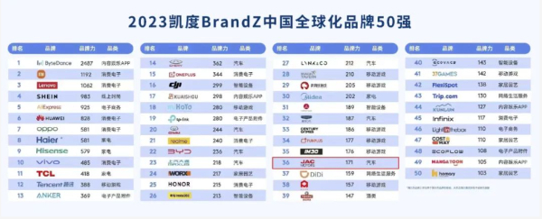 6月中旬,全球知名品牌排行榜凱度BrandZ攜手谷歌發(fā)布了《2023凱度BrandZ中國全球化品牌50強(qiáng)》榜單,江淮汽車位列中國全球化品牌第36位,相較2022年上升了4個(gè)名次,這是江淮汽車連續(xù)三年榮登該榜單,展現(xiàn)了持續(xù)、強(qiáng)勁的品牌增長(zhǎng)勢(shì)頭。