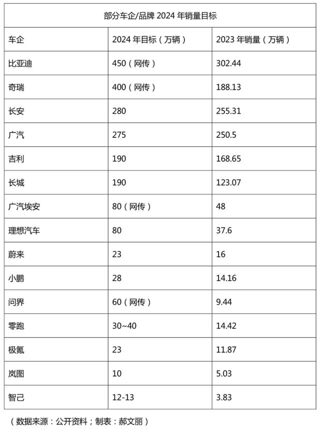 有的車企理性十足,將2024年目標(biāo)定在比2023年銷量略高;有的車企則相當(dāng)狂熱,目標(biāo)翻倍甚至翻幾倍!車企們2024年的目標(biāo)能實(shí)現(xiàn)嗎?超高目標(biāo)的車企哪來(lái)的自信?我們從中挑選了部分車企,對(duì)其公布的銷量目標(biāo)進(jìn)行盤(pán)點(diǎn)及分析,一探究竟。