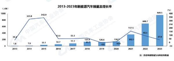 據(jù)中汽協(xié)統(tǒng)計分析,2023年我國新能源汽車產(chǎn)銷分別完成958.7萬輛和949.5萬輛,同比分別增長35.8%和37.9%,市場占有率達(dá)31.6%。