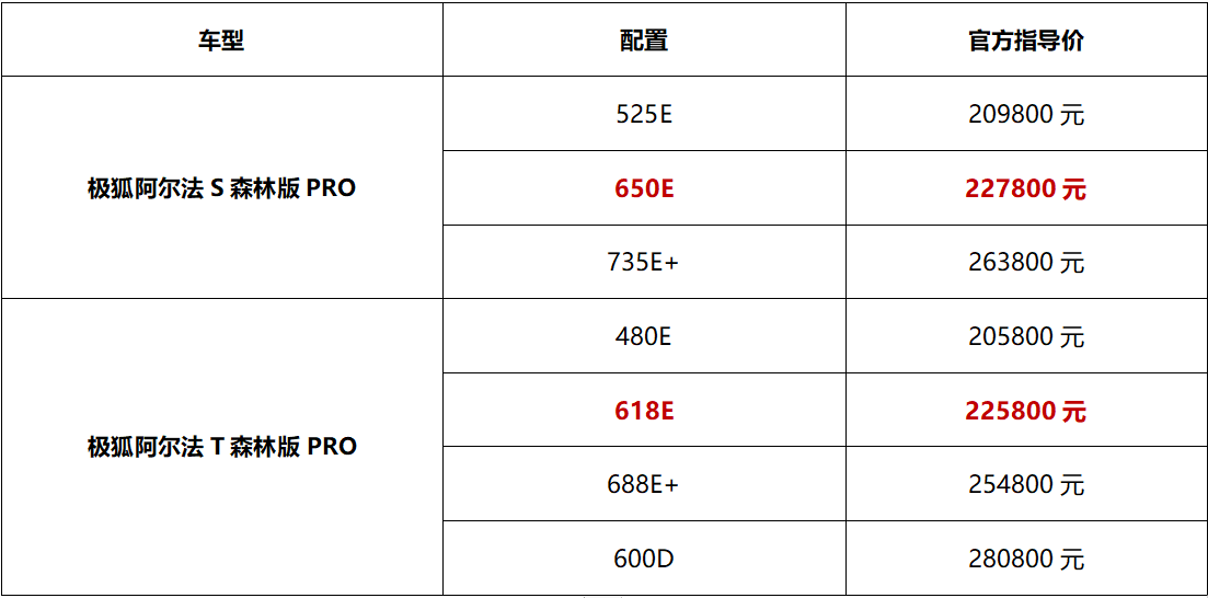 1月25日,極狐汽車旗下阿爾法S/T森林版PRO整體在原森林版基礎上,圍繞前后排座椅加熱/按摩、真皮方向盤、熱泵空調等豪華、舒適性配置進行多維升級,同時還新增了阿爾法S森林版PRO 650E、阿爾法T森林版PRO 618E,官方指導價分別為22.78萬元、22.58萬元。