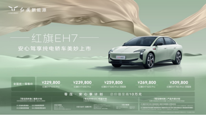 隨著環(huán)保意識的提升和新能源技術(shù)的飛速發(fā)展,新能源汽車成為全球汽車產(chǎn)業(yè)發(fā)展的新方向。紅旗新能源緊隨時代潮流,于3月20日在深圳舉辦“安心駕享·紅旗EH7上市發(fā)布會”,推出了其在新能源領(lǐng)域的里程碑產(chǎn)品——紅旗EH7,全國統(tǒng)一零售價為22.98萬-30.98萬元。這款車的推出,不僅增強了紅旗新能源的市場競爭力,也為汽車行業(yè)的綠色轉(zhuǎn)型和技術(shù)革新樹立了新典范。