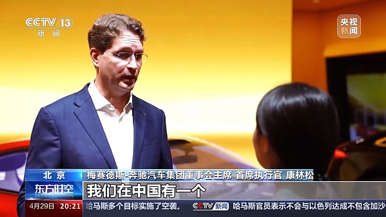 梅賽德斯-奔馳汽車集團(tuán)董事會(huì)主席、首席執(zhí)行官 康林松:我們?cè)谥袊?guó)有一個(gè)非常全面的電動(dòng)化戰(zhàn)略。在中國(guó),研發(fā)對(duì)我們來(lái)說(shuō)變得越來(lái)越重要。(央視新聞客戶端)