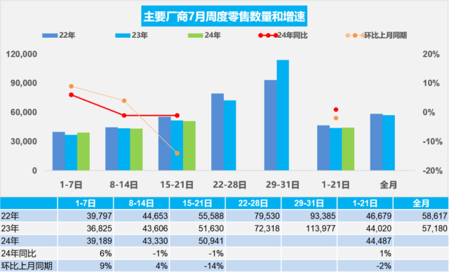 在新能源乘用車市場(chǎng)方面,7月1-21日,乘用車新能源市場(chǎng)零售46.1萬輛,同比去年同期增長26%,較上月同期下降2%,今年以來累計(jì)零售457.4萬輛,同比增長32%。