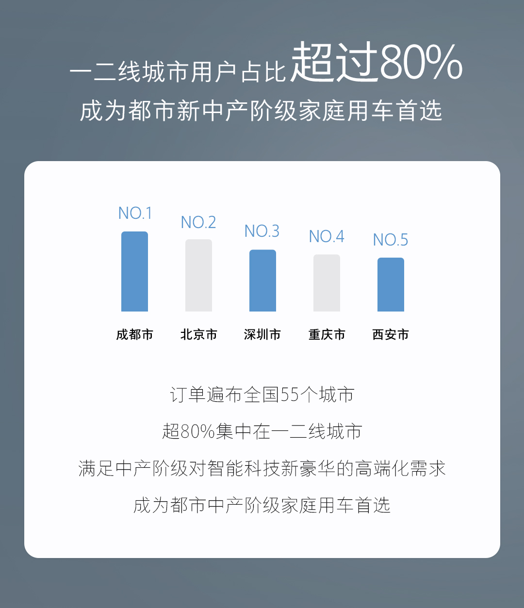 全新藍(lán)山的訂單已覆蓋全國(guó)55個(gè)城市,主要集中在成都、北京、深圳、重慶、西安等一二線城市,不僅彰顯了這些都市精英人群對(duì)高端智能出行方式的追求,更體現(xiàn)了其對(duì)智能駕駛和奢華配置的高要求。
