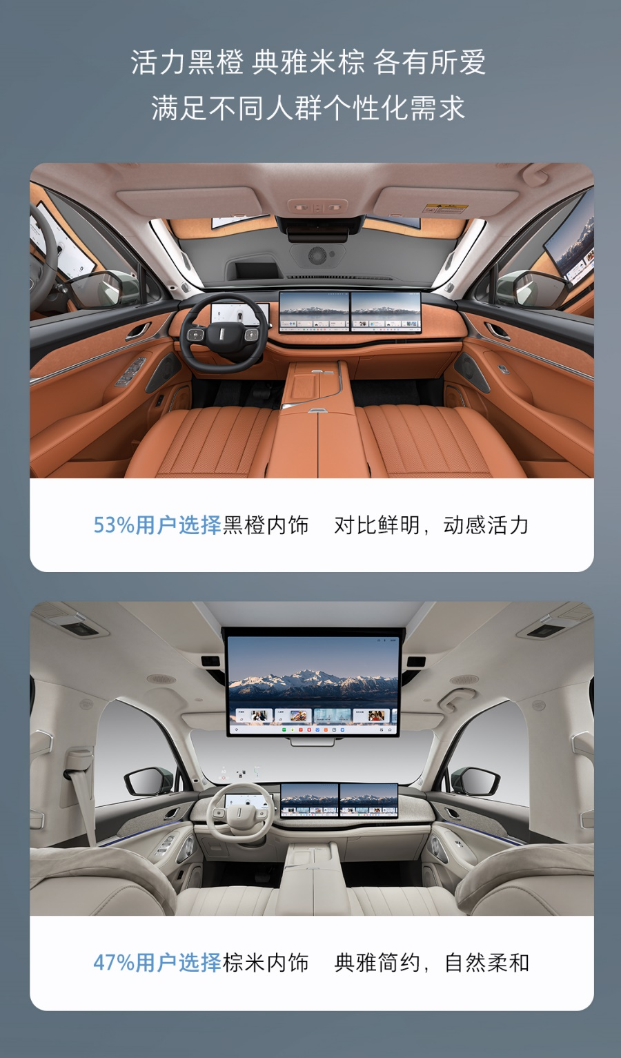 在內(nèi)飾方面,黑橙搭配占比53%,既保留了黑色的神秘感,又融入了橙色的活力元素,整體風(fēng)格不失優(yōu)雅大氣,又充滿動(dòng)感與生機(jī),彰顯出對(duì)比鮮明、溫暖陽光的空間氛圍;棕米內(nèi)飾則以47%的占比,為車艙營(yíng)造一抹精致與高雅,高級(jí)質(zhì)感,一眼望去平和寧靜,營(yíng)造出自然柔和的家庭氛圍,同樣符合更多用戶的審美需求。