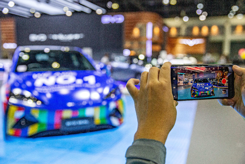 (資料圖片)3月27日,一名觀眾在泰國曼谷國際車展上拍攝一款中國品牌汽車。 新華社記者 王騰 攝