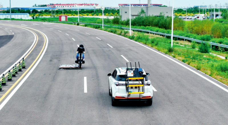測(cè)試車輛在天津(西青)國(guó)家級(jí)車聯(lián)網(wǎng)先導(dǎo)區(qū)封閉測(cè)試場(chǎng)內(nèi)進(jìn)行自動(dòng)駕駛主動(dòng)安全功能測(cè)試 (2024年6月14日攝) 孫凡越攝
