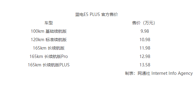 | 藍(lán)電E5 PLUS正式上市 售價(jià)9.98萬-13.58萬元 |