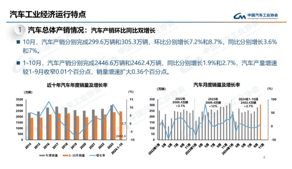 中汽協(xié)發(fā)布數(shù)據(jù)顯示,10月,汽車產(chǎn)銷分別完成299.6萬輛和305.3萬輛,環(huán)比分別增長7.2%和8.7%,同比分別增長3.6%和7%。1-10月,汽車產(chǎn)銷分別完成2446.6萬輛和2462.4萬輛,同比分別增長1.9%和2.7%,汽車產(chǎn)量增速較1-9月收窄0.01個(gè)百分點(diǎn),銷量增速擴(kuò)大0.36個(gè)百分點(diǎn)。