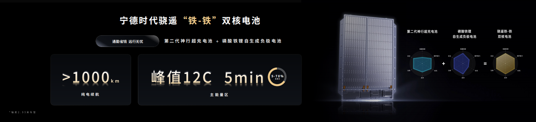 三元鐵/雙三元雙核電池:三元電池+磷酸鐵鋰自生成負極電池,主能量區(qū)三元電池充電倍率峰值可達12C,能提供超1兆瓦的強勁動力,當電量低至20%時仍可輸出超600KW的功率;由三元電池+三元自生成負極電池搭配的升級版產品——驍遙“雙三元”雙核電池,在軸距3米的轎車上配電量可突破180度,純電續(xù)航里程突破1500公里。